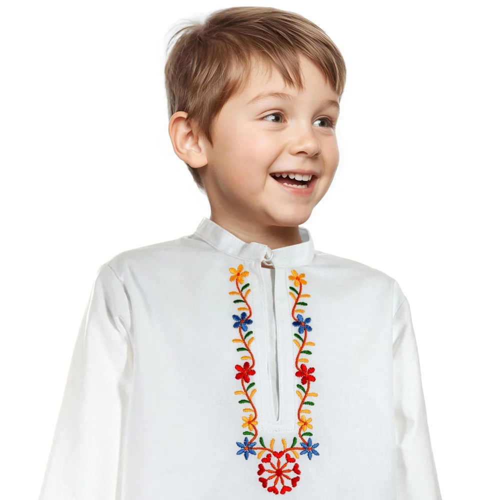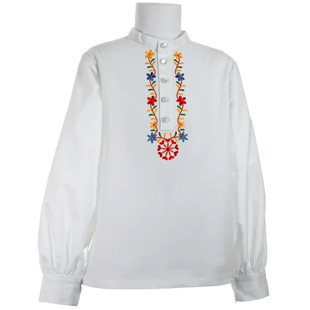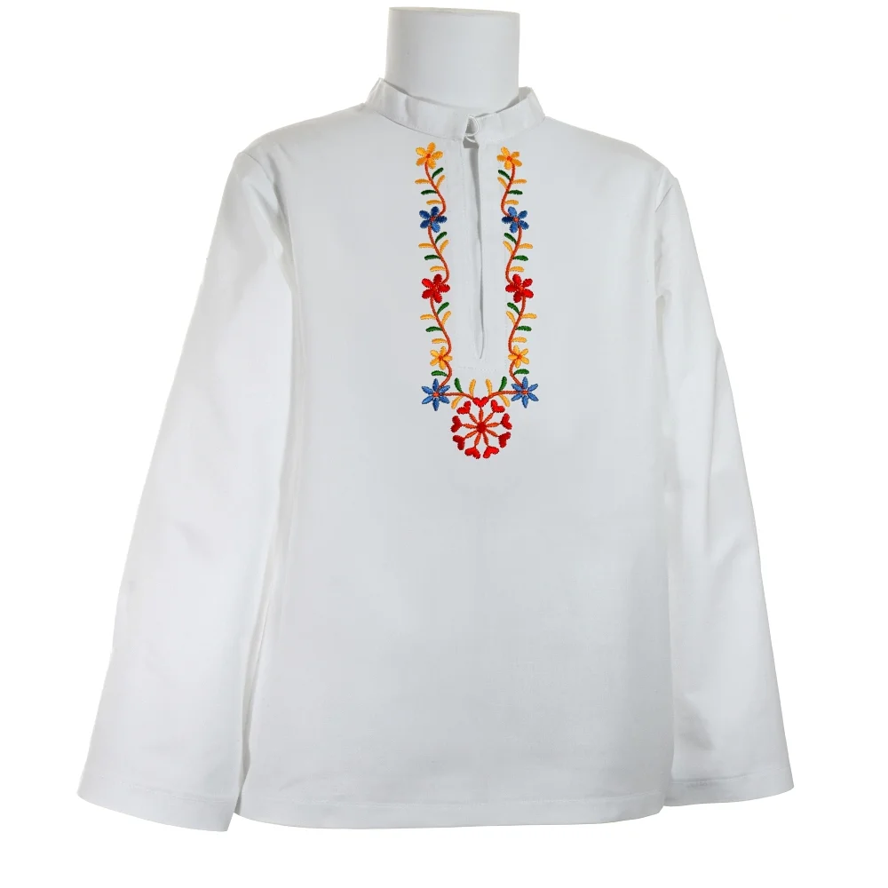 Detská chlapčenská krojová košeľa "Maroško" je zdobená na hrudi hladkovanou výšivkou.