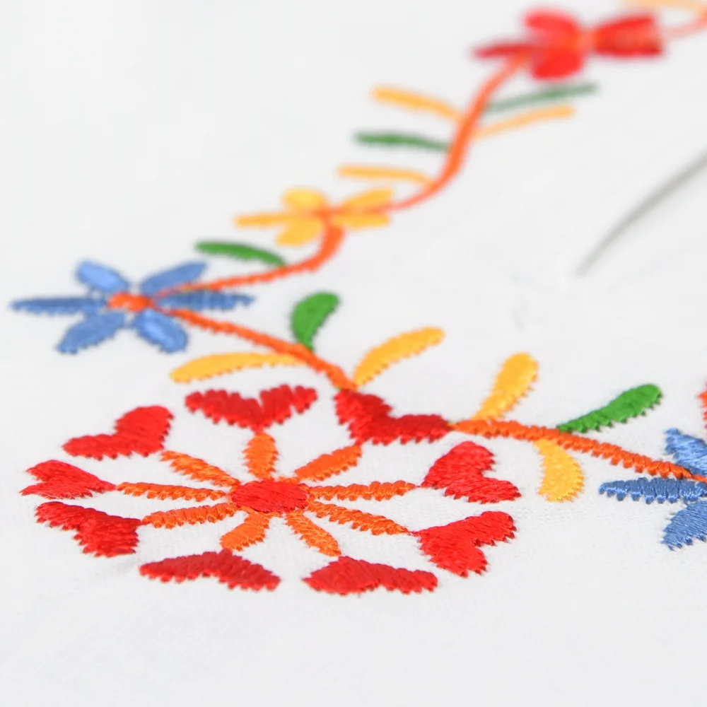 Výšivka je strojová, s použitím vlastných stehov so snahou o napodobenie ručného vyšívania. Aj preto je na nerozoznanie od ručnej výšivky. Základným materiálom je bavlnené plátno.