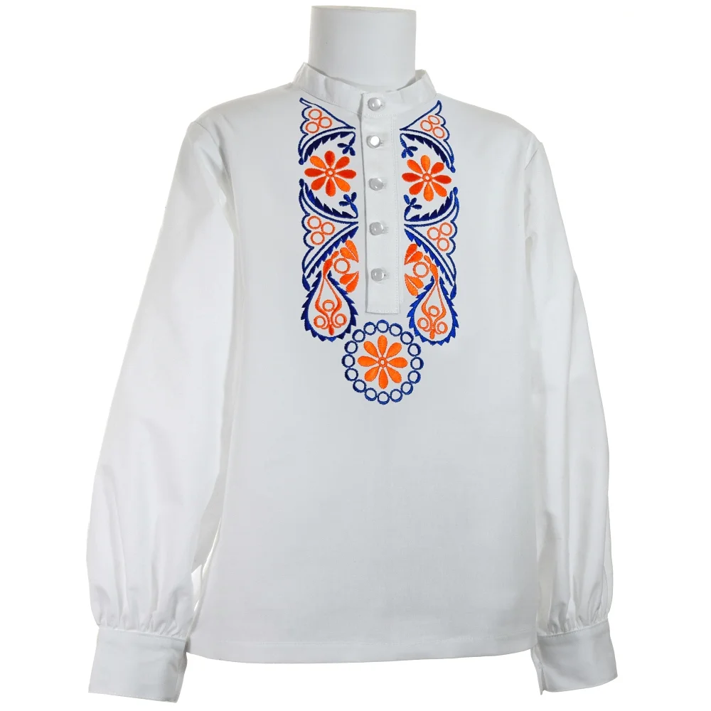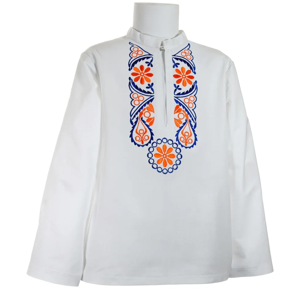 Detská chlapčenská krojová košeľa "Ľubko" je zdobená na hrudi hladkovanou výšivkou.