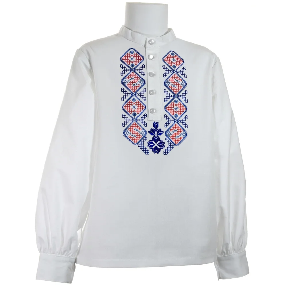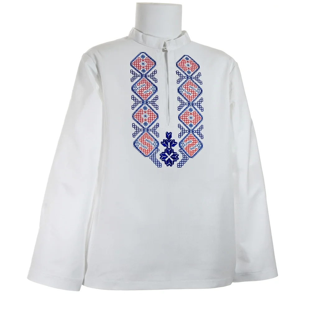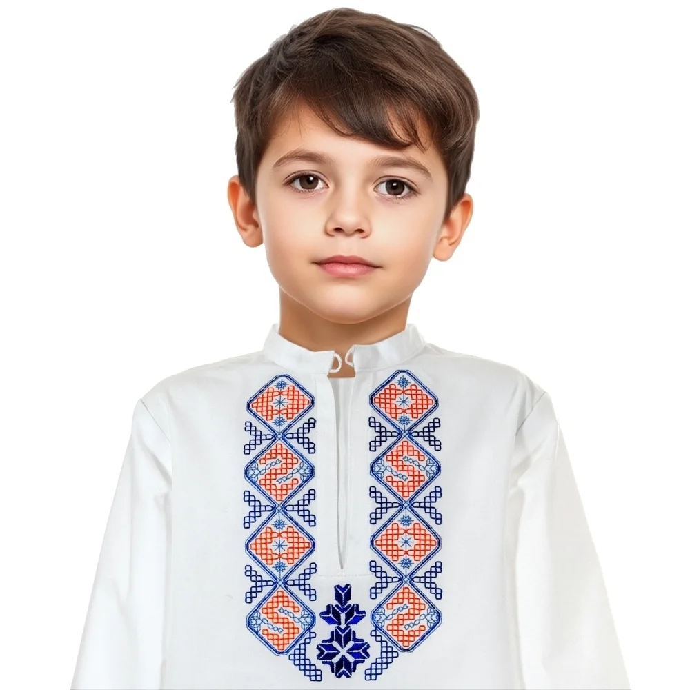 Detská chlapčenská krojová košeľa "Dušanko" je zdobená na hrudi krížikovou výšivkou.