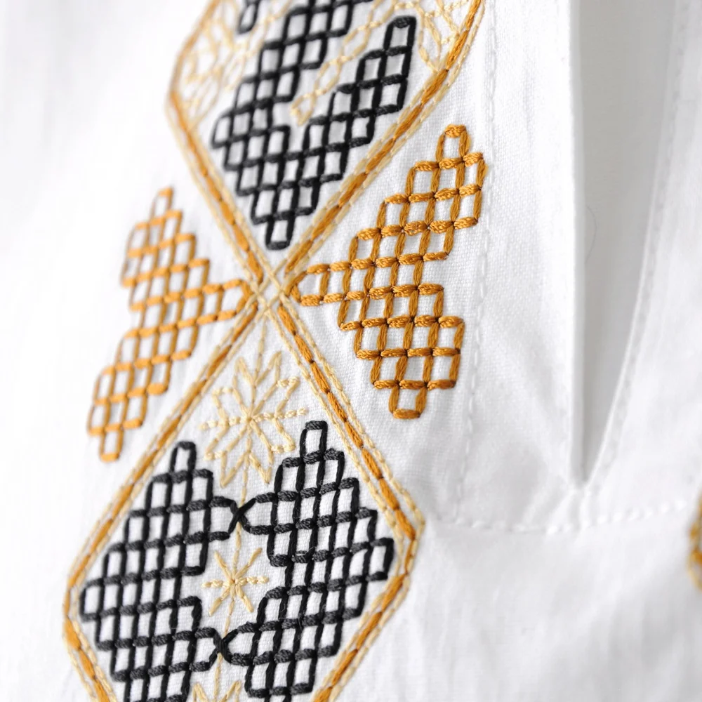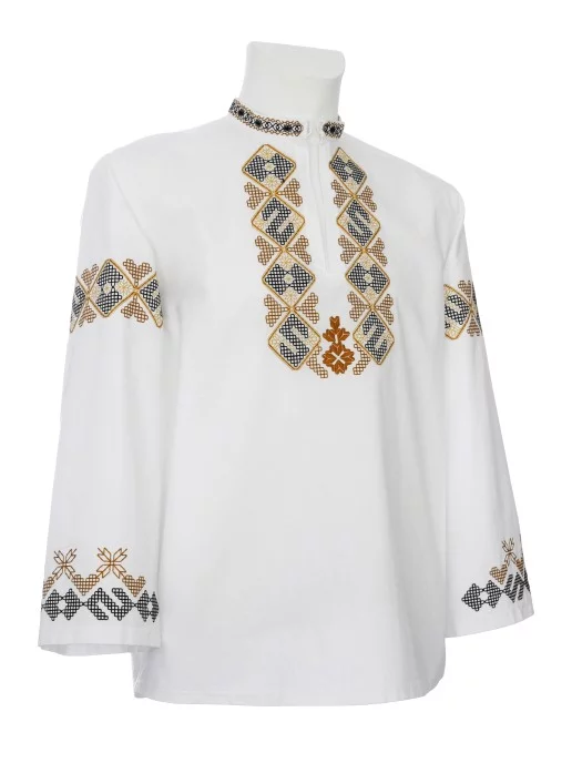 Krojová košeľa "DUŠAN" (s mažetami) je zdobená hladkovanou a krížikovou výšivkou na hrudi, límci, ramenách a nad zápästím.