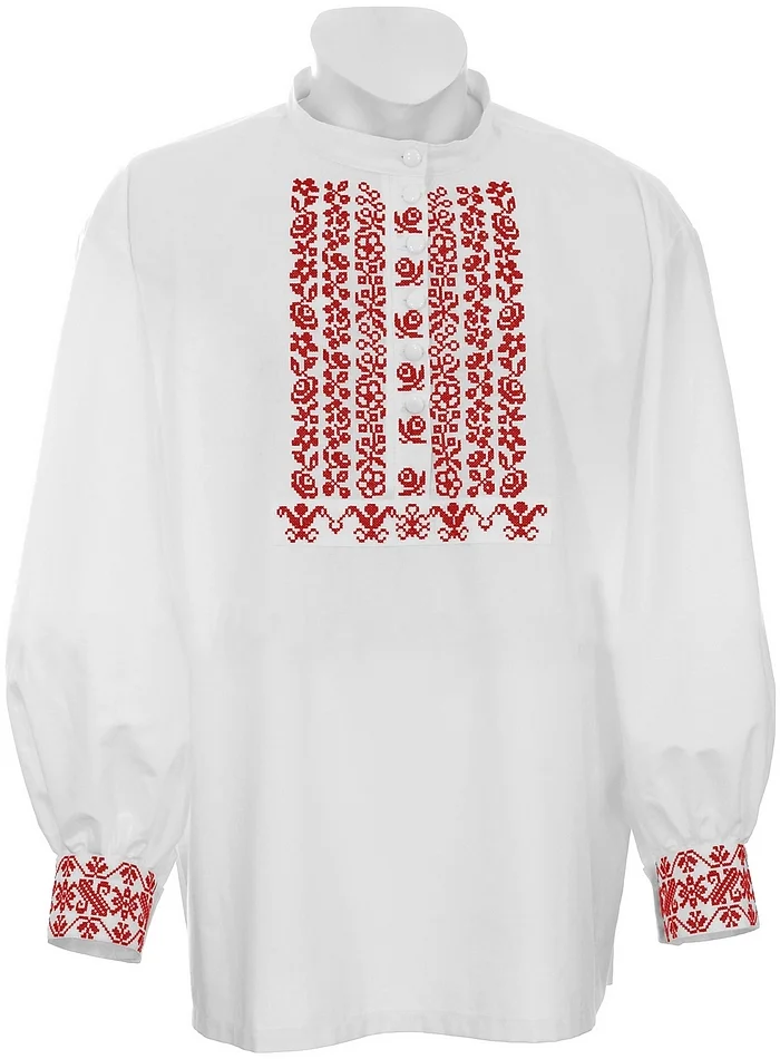 Krojová košeľa "FRANTIŠEK" je zdobená krížikovou výšivkou na hrudi a manžetách. Zapínanie manžiet a rozporku je na gombíky.