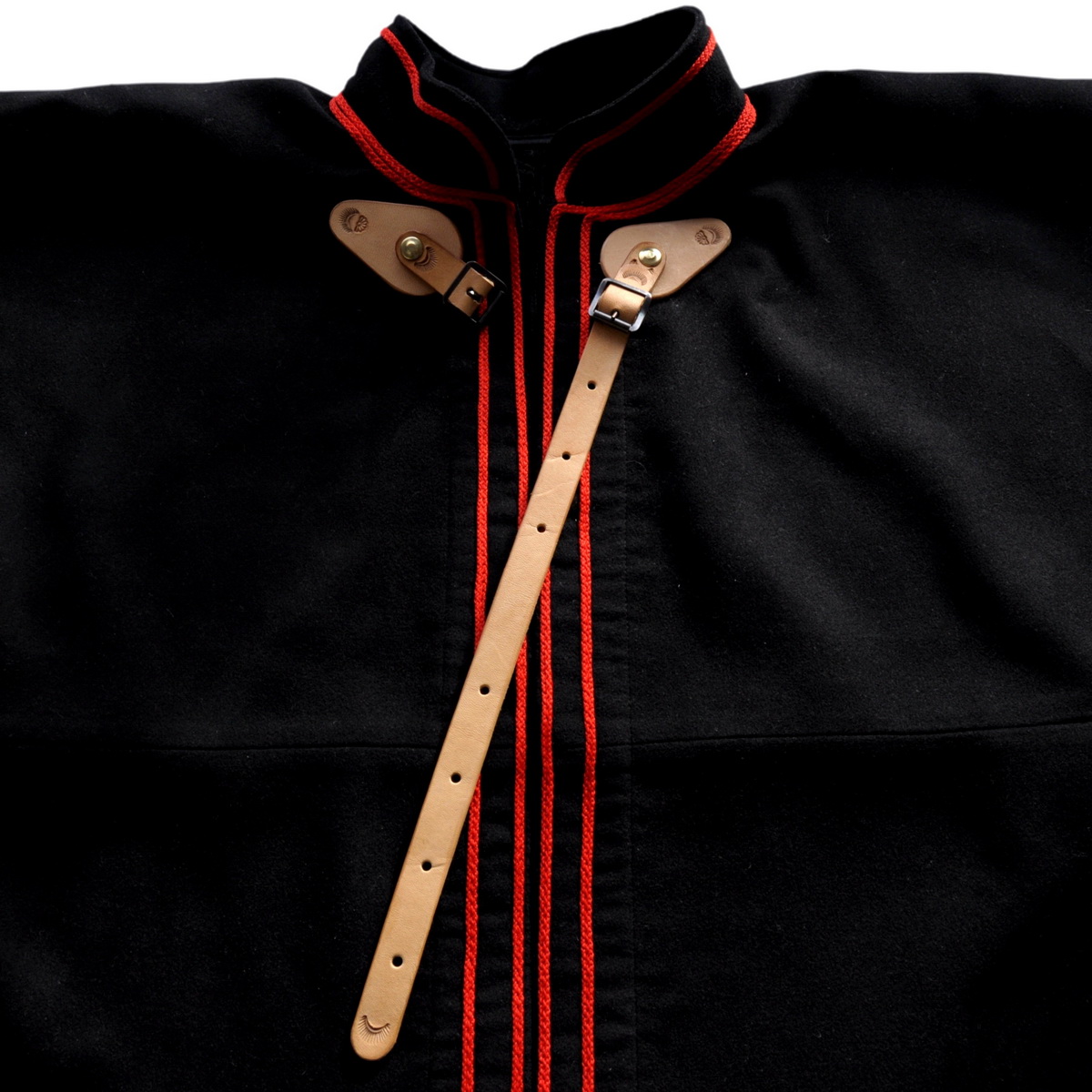 Základom je pripevnenie dvoch sedlárskych praciek na súkno kabáta. Upevnenie praciek je možné prišitím kožených praciek na látku, alebo aj prilepením kože kontaktným lepidlom. Remeň má dĺžku 40 cm a je možné zložiť z kabáta. Kožený remeň sa dá skrátiť.